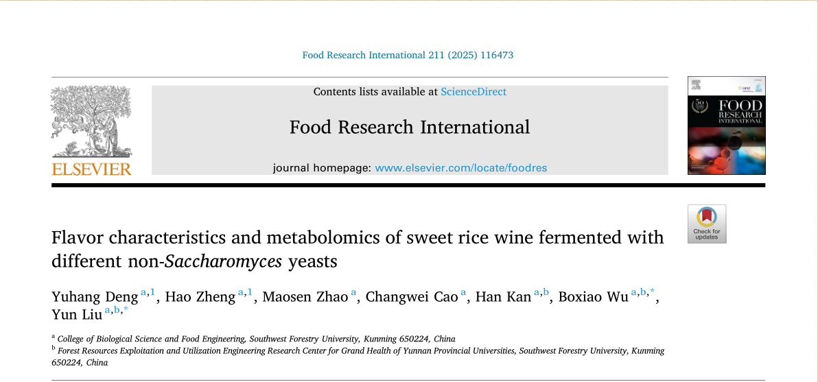 近期,bevictor1946韦德官网森林资源功能化学与健康食品创新团队以甜米酒为原料,研究非酿酒酵母对产品风味的改善领域取得新研究进展。相关成果以“Flavor characteristics and metabolomics of sweet rice wine fermented with different non-Saccharomyces yeasts”为题发表在农林科学类中科院一区TOP期刊《Food Research International》(IF=8.0)上。bevictor1946韦德官网食品加工与安全专业2022级硕士研究生邓玉...