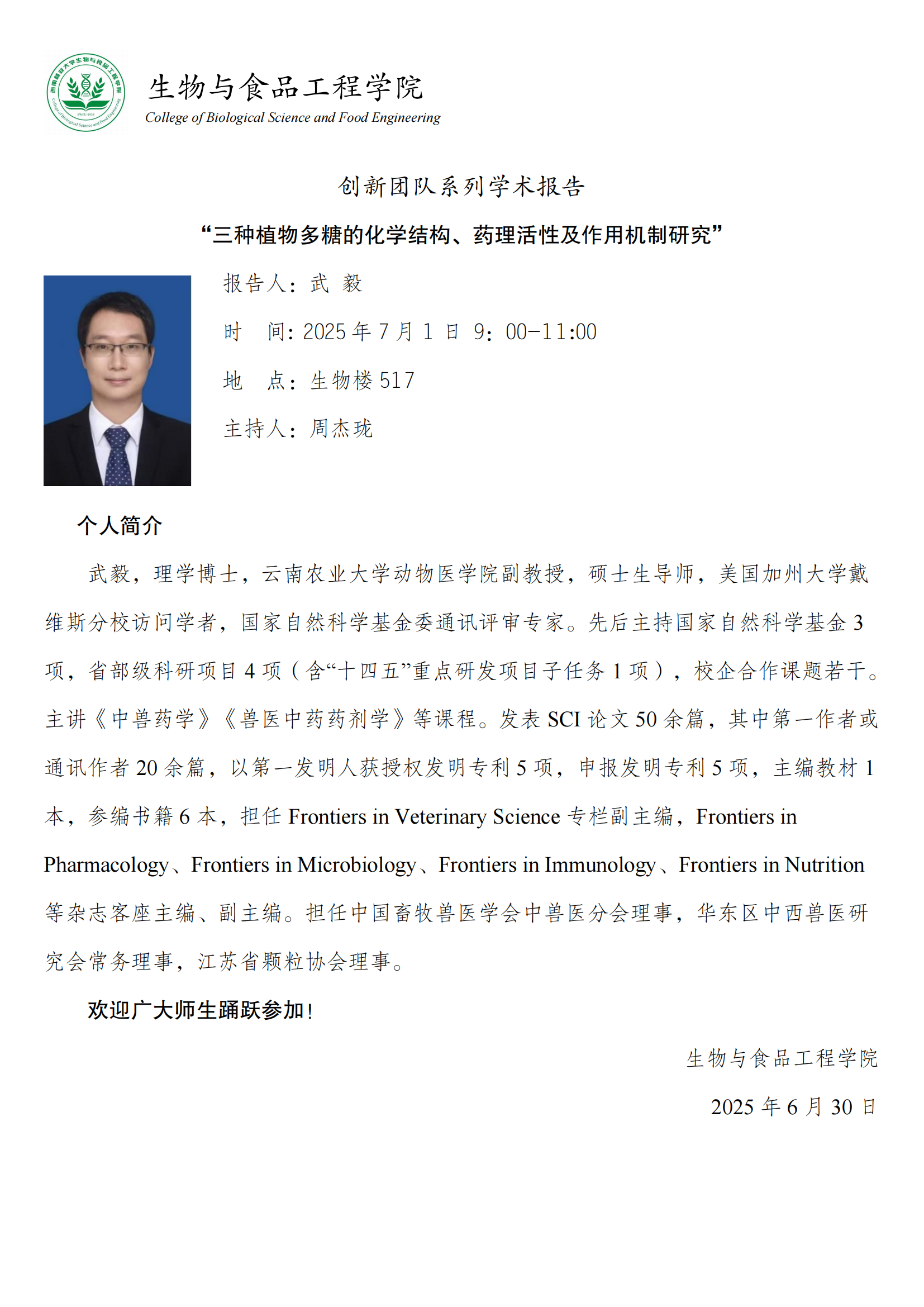 【创新团队系列学术报告】三种植物多糖的化学结构、药理活性及作用机制研究