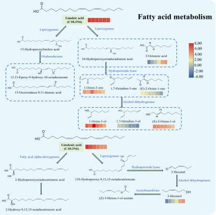 2025年11月,bevictor1946韦德官网(食用菌现代产业公司)郭磊博士课题组在SCI I区top期刊《LWT - Food Science and Technology》上发表了一篇题为 “Unlocking the chemical basis of dried Boletus edulis: Focus on lipid oxidation and Maillard reaction on characteristic flavor formation” 的文章,探究了美味牛肝菌在采后干燥阶段中挥发性风味物质的动态变化及挥发性有机物、氨基酸和单糖之间的相关性。通过美味牛肝菌中的脂肪酸代谢物及其与关键挥发性有机物的相关性,初步研究了脂肪酸的代谢途径。这些发现为美味牛肝菌采后干制过程中风味形成机制提供了重要的理论见解,也为食用菌加工中的风味质量控制提供了参考。