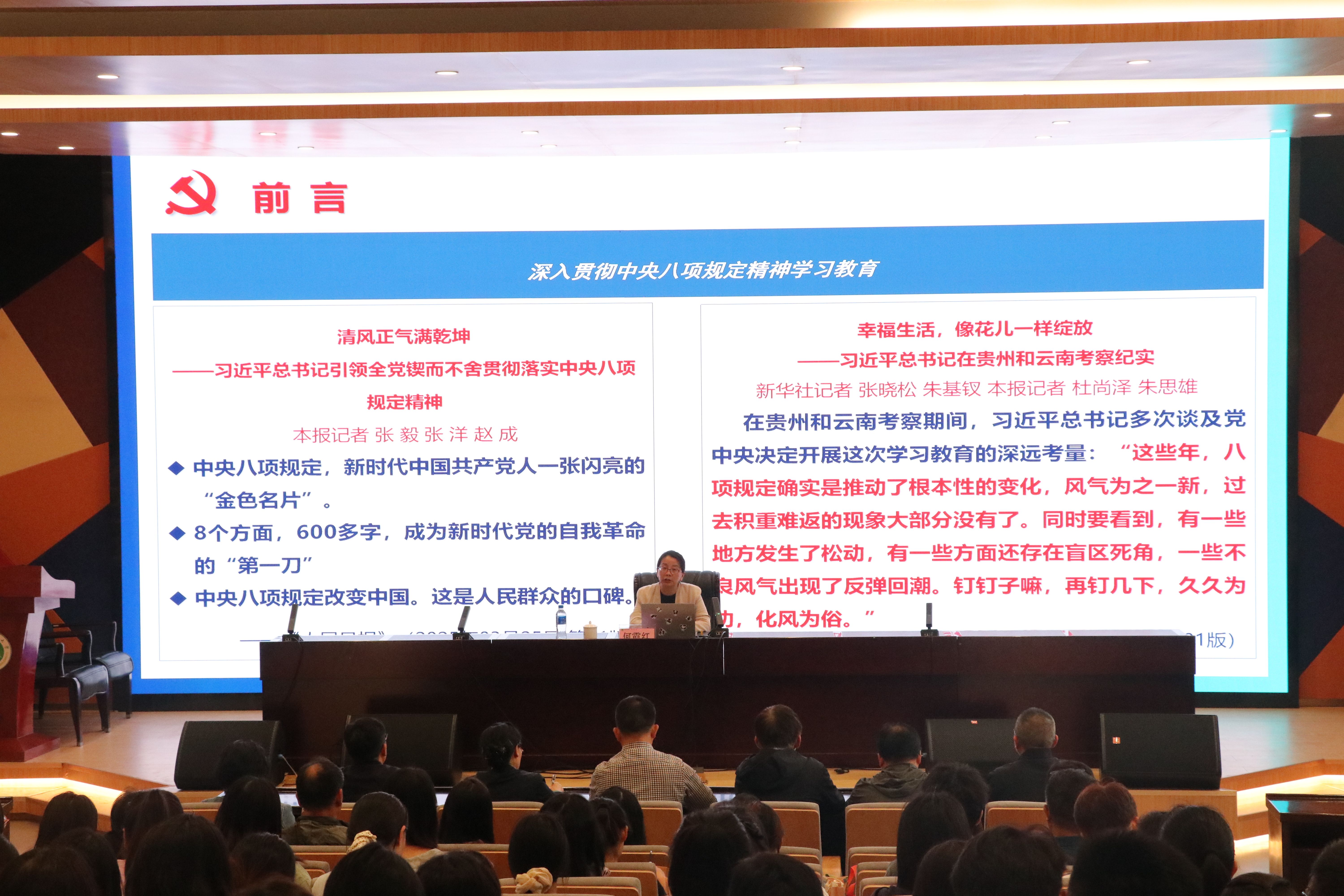 6月9日,何霞红副董事长以“深入贯彻中央八项规定精神,持续推进党的作风建设”为题,为分管部门、联系公司及党支部的师生党员讲授了一堂深刻而生动的党课。何副董事长从历史角度阐述作风建设的重要性,强调了中央八项规定精神的内涵、历史意义、实践成效以及如何深化作风建设展开阐述。要求全体党员、干部要提高政治站位,将深入贯彻中央八项规定精神作为践行“两个维护”的实际行动;坚持问题导向,紧盯关键领域和重要节点,做到防微杜渐;强化担当作为,服务师生群众,以优良作风推动公司事业高质量发展。