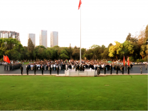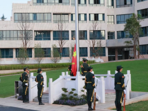升旗仪式于清晨七点准时开始,全体师生肃立,迎国旗、升国旗,奏唱国歌。在庄严的国歌声中,五星红旗冉冉升起,与朝阳交相辉映,师生们表达了对祖国的深切热爱与崇高敬意。