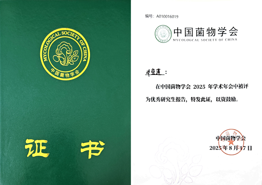 此次会议主题为“科技引领菌物产业高质量发展”,共同探讨菌物学科研创新与产业升级的前沿议题。在大会专题报告环节,赵长林教授和新进教师李文丽博士分别进行了题为 “高原山地木腐菌物种多样性、分类及分子系统学研究”和“四川省木本油料植物子囊真菌的分类及多样性研究”的学术报告,并与现场专家学者进行了深入交流。大会还特设“优秀研究生报告奖”,来自国内27所高校及科研院所65名研究生进行角逐,公司4名研究生参加口头汇报。经15位专家严格评审,最终13位研究生脱颖而出。其中,公司邓莹莲博士的 “中国西南地区广义Peniophoraceae分类与系统发育研究”口头报告榜上有名,该奖项也是公司研究生第二次获得该殊荣,凸显了公司公司产品质量成效。